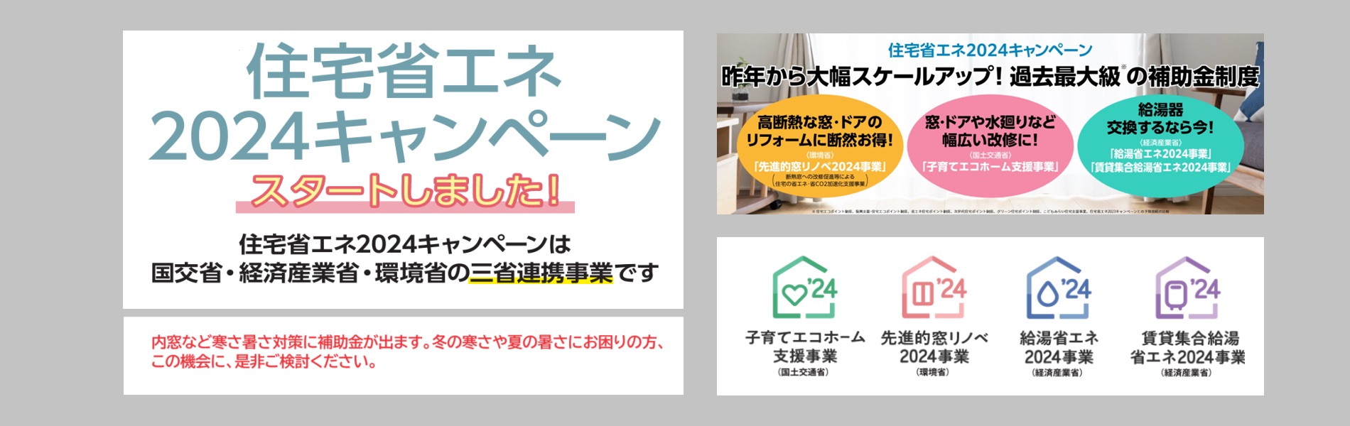 住宅省エネ 2024キャンペーン 先進的窓リノベ 2024事業 高断熱な窓・ドアの リフォームにお得! (最大200万円) 子育てエコホーム 支援事業 窓・ドアや水廻りなど 幅広い改修に! (リフォームで20万円) (新築で最大100万円) 給湯省エネ 2024事業 家庭用燃料電池や 給湯器の交換・購入に! (8~20万円)
